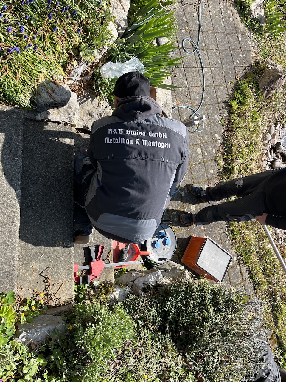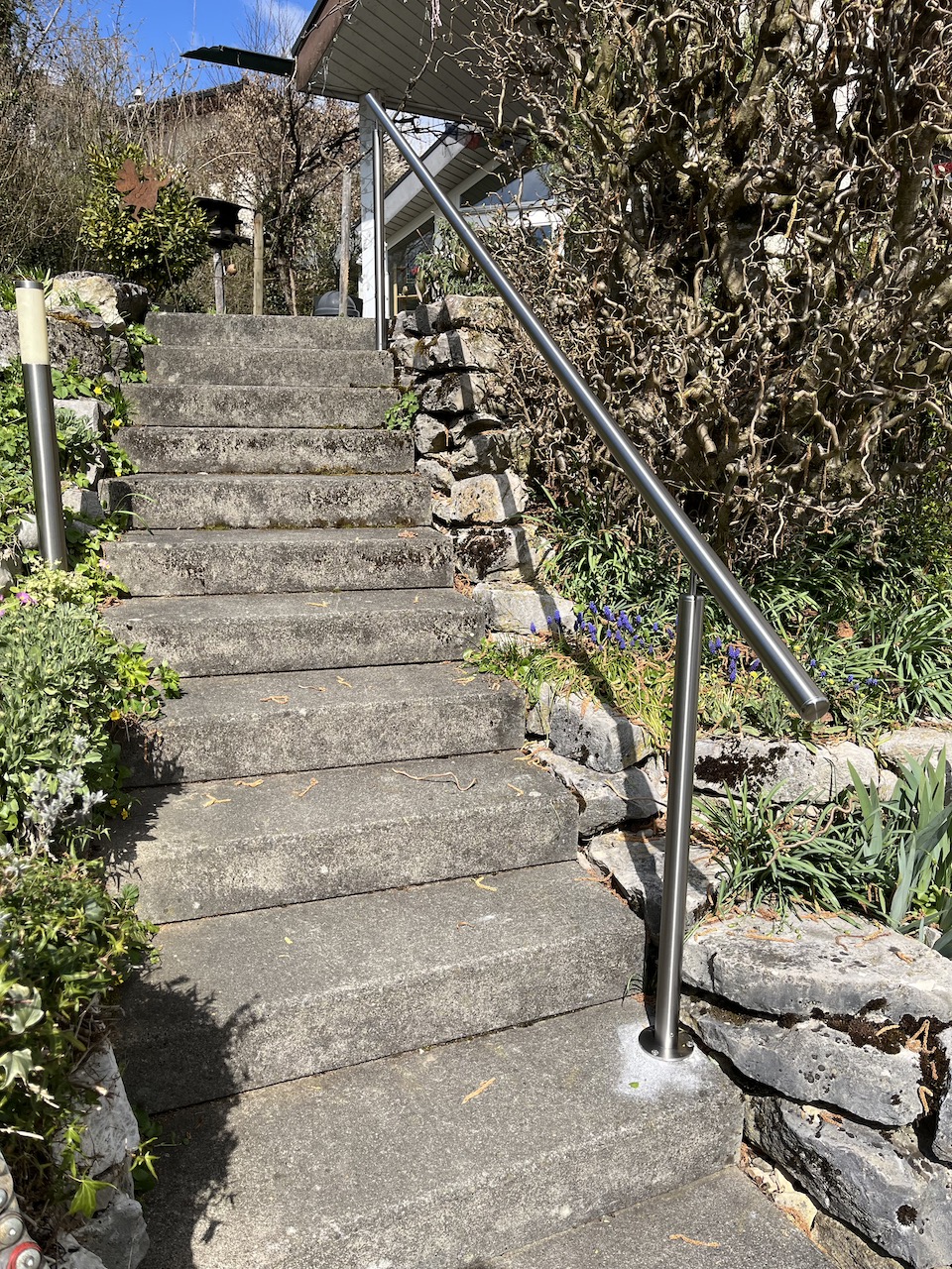 Unsere Aussentreppe hat einen professionellen Handlauf bekommen. Oli und Raffi von der R & B Swiss GmbH haben ihn vor Ort zugeschnitten, angepasst und montiert. Super Sache!